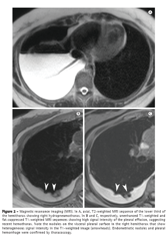 A endometriose é uma doença ginecológica benigna associada à dor pélvica e infertilidade que afeta principalmente mulheres em idade reprodutiva. A endometriose torácica afeta o parênquima pulmonar ou a pleura. Relatamos os casos de duas pacientes com endometriose pleural que apresentaram pneumotórax recorrente. Em ambos os casos, a ressonância magnética de tórax mostrou hidropneumotórax à direita e nódulos redondos, bem definidos, na superfície pleural à direita. A ressonância magnética é uma boa opção para a caracterização dos nódulos de endometriose pleural e de derrame pleural hemorrágico.