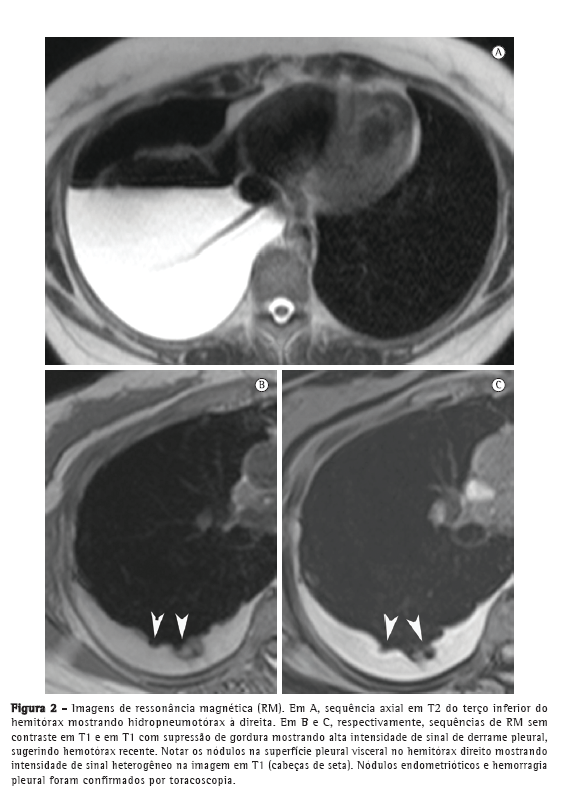 A endometriose é uma doença ginecológica benigna associada à dor pélvica e infertilidade que afeta principalmente mulheres em idade reprodutiva. A endometriose torácica afeta o parênquima pulmonar ou a pleura. Relatamos os casos de duas pacientes com endometriose pleural que apresentaram pneumotórax recorrente. Em ambos os casos, a ressonância magnética de tórax mostrou hidropneumotórax à direita e nódulos redondos, bem definidos, na superfície pleural à direita. A ressonância magnética é uma boa opção para a caracterização dos nódulos de endometriose pleural e de derrame pleural hemorrágico.