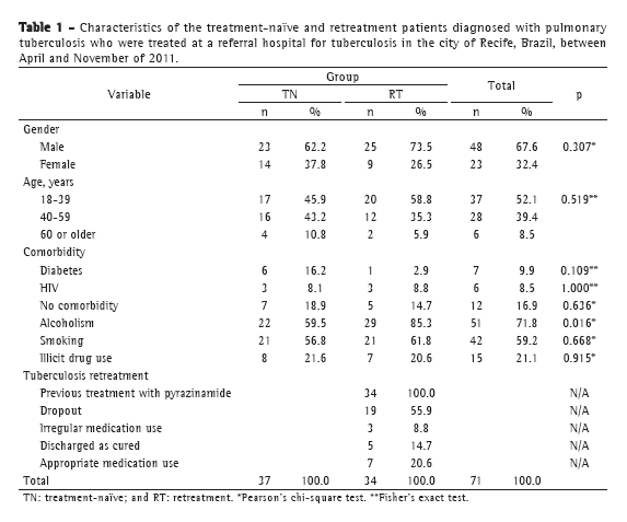 Comorbidities are risk factors for the occurrence of clinical presentations that are more severe and difficult to diagnose or that are responsible for affecting tuberculosis treatment success. Alcoholism and smoking are clearly related to MDR tuberculosis.(15,16) Other studies have revealed that alcoholism(18) and HIV/AIDS are factors associated with dropping out of pulmonary tuberculosis treatment.(19) In the present study, we found high rates of alcoholism (71.8%) and smoking (59.1%). This occurred similarly in the TN and RT groups, and it might be related to disease susceptibility. However, alcoholism was the only variable for which there was a significant difference between the TN and RT groups, and it might be associated with a higher rate of treatment dropout.