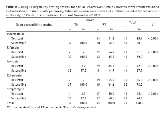 In Brazil, most cases of MDR tuberculosis are cases of post-primary or acquired disease unrelated to HIV co-infection or institutional outbreaks and resulting from irregular medication use and treatment dropout. Among new tuberculosis cases, the rate of new cases of MDR tuberculosis is 0.9%.(21) In the present study, primary isoniazid resistance and primary streptomycin resistance, respectively, were found in 1 (2.7%) and 1 (2.7%) patient in the TN group. These rates are higher than the national average. However, the study was conducted at a referral hospital for tuberculosis, which might result in overestimation of rates. Nevertheless, there was no primary pyrazinamide resistance.