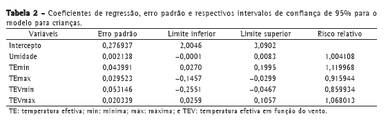 onde Pcria é o número de crianças com pneumonia, P é a precipitação, V é a velocidade dos ventos e TEmin é a TE mínima, com R2 = 68,4% e R2 ajustado = 50,3%.