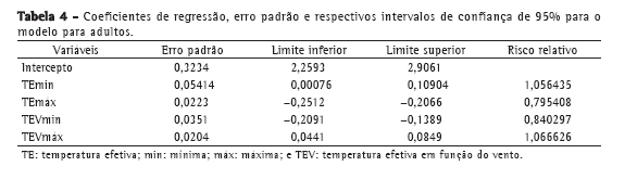 As Tabelas 2, 3 e 4 mostram os riscos relativos e as variáveis explicativas para o modelo em relação a crianças, lactentes e adultos. Os coeficientes b assumiram valores negativos e positivos dependendo da variável, confirmando que o número de internações diminui quando esses valores aumentam, ou seja, quanto menor o for o CTH, maior é o número de pessoas com doenças do aparelho respiratório e vice-versa. O maior risco relativo (IC95%) foi para a variável temperatura mínima, seguido do indicador biometeorológico que envolve as temperaturas, umidade relativa e velocidade dos ventos.