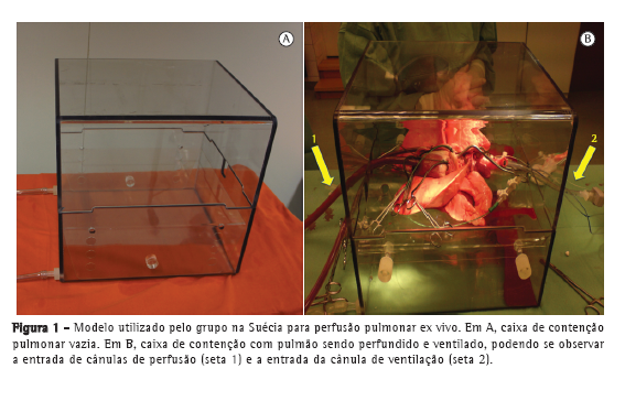 O sistema de perfusão descrito originalmente por Steen et al. consiste em uma caixa rígida e transparente de formato retangular (Figura 1) para o suporte do bloco pulmonar, com entrada e conexão do conjunto de tubos de circulação extracorpórea; uma bomba centrífuga; um trocador de calor; um oxigenador de membranas; e, para a monitorização do sistema, são utilizados um transdutor de pressão, um fluxômetro e um termômetro, bem como seus respectivos monitores. O perfusato desse circuito consiste de 1.500 mL de solução de Steen, acrescido de uma quantidade variável de concentrados de hemácias, resultando em um perfusato com um nível de hematócrito em torno de 15%. Para permitir a "desoxigenação" do perfusato através da membrana de troca gasosa, uma mistura de gases (nitrogênio, oxigênio e dióxido de carbono) é utilizada, sendo seu fluxo ajustado de forma a obter uma concentração de gases no perfusato que se assemelhe à do sangue venoso. Segundo o protocolo de Lund, o fluxo e a temperatura devem ser gradualmente aumentados. A ventilação inicia-se quando a temperatura atinge 32°C e o fluxo máximo nunca deve ultrapassar valores que determinem uma pressão de artéria pulmonar maior que 20 mmHg. A avaliação mais importante é obtida pela gasometria do perfusato colhido das veias pulmonares, quando a temperatura atinge 37°C.(11)