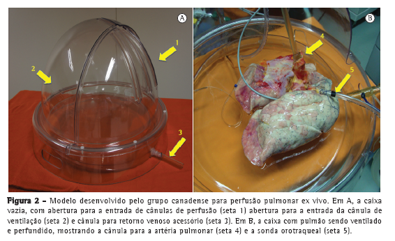 A perfusão pulmonar em circuitos mecânicos não é um conceito novo, sendo amplamente utilizada em estudos de fisiologia pulmonar para animais de pequeno e médio porte.(8,9) Porém, a PPEV de pulmões humanos apresentava uma limitação técnica importante devido a sua incapacidade de manter a integridade da barreira alvéolo-capilar, determinando o aumento da resistência vascular e a formação de edema, que levava a inexorável perda de função pulmonar.(7)