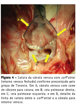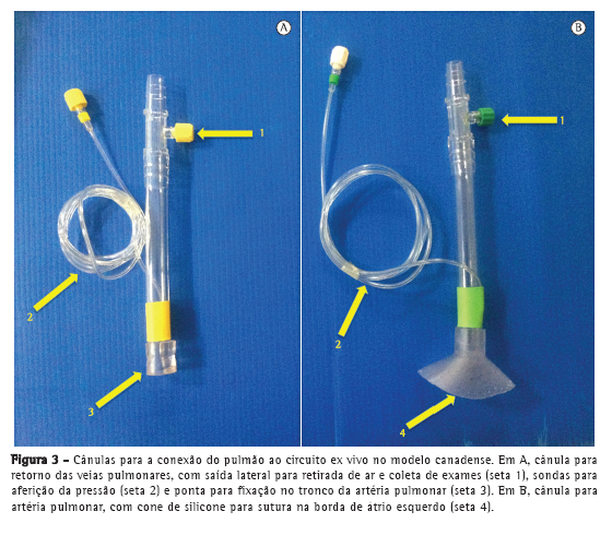 O grupo canadense da Universidade de Toronto, animado com os bons resultados do grupo sueco, iniciou seus estudos com o modelo ex vivo objetivando a recuperação de órgãos não aptos a transplante. Uma característica marcante de suas pesquisas foi a preocupação em prolongar o tempo de perfusão. Para essa finalidade, o grupo estabeleceu em seu protocolo de perfusão as seguintes modificações: uso de perfusato acelular, ou seja, sem adição de hemácias, constituído somente por solução de Steen; fluxo de perfusão máximo calculado em aproximadamente 40% do débito cardíaco; e a manutenção da pressão de artéria pulmonar em 10-15 mmHg. O uso de um perfusato acelular facilita a logística por diminuir o custo, além de evitar um eventual conflito ético devido à utilização de hemoderivados para estudos de órgãos que nem sempre serão utilizados clinicamente. Os prejuízos do uso de sangue no perfusato incluem a hemólise ocasionada pelo trauma mecânico sofrido pelas hemácias e a atividade pró-inflamatória própria da transfusão. Essas modificações foram bem sucedidas para prolongar o tempo de perfusão ex vivo por até 12 h.(15) A ausência de glóbulos vermelhos não comprometeu a avaliação da função pulmonar, pois é alto o grau de difusão de oxigênio no perfusato com solução de Steen, permitindo assim a realização de gasometrias fidedignas. O grupo também desenvolveu um novo modelo de caixa de contenção em formato arredondado (Figura 2) e cânulas especificas (Figura 3) que permitem uma melhor conexão da artéria pulmonar e do coto do átrio esquerdo (ligação das veias pulmonares) com o circuito. Além disso, essas cânulas possuem cateteres de pressão embutidos. A cânula atrial permite que a perfusão seja realizada de forma fechada (Figura 4) e que a pressão do átrio seja mantida em 3-5 mmHg. Enquanto o protocolo sueco preconiza 1 h de perfusão normotérmica, o protocolo canadense preconiza pelo menos 4 h de perfusão normotérmica com parâmetros estáveis para que o órgão seja considerado apto a transplante. O Quadro 1 compara aspectos dos protocolos para PPEV das universidades de Lund e de Toronto.