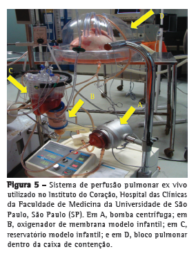 No Brasil, Pêgo-Fernandes et al. começaram seus estudos com a PPEV em 2008. Sua primeira publicação no Jornal Brasileiro de Pneumologia em 2009 descrevia a modificação do circuito visando a economia da solução utilizada para a reperfusão ex vivo.(16) O sistema de perfusão descrito foi formado por um conjunto de tubos, reservatório venoso e oxigenador de membrana, todos de modelo infantil (Figura 5). Completam o sistema um trocador de calor e uma bomba centrífuga (Braile Biomédica, São José do Rio Preto, Brasil). O bloco pulmonar permanece em uma caixa rígida transparente (Vitrolife) com uma sonda orotraqueal na traqueia e com cânula de perfusão (Vitrolife) introduzida no tronco da artéria pulmonar. O retorno da solução pelas veias pulmonares nos trabalhos experimentais era realizado diretamente para a caixa de contenção, sendo drenada para o reservatório venoso por gravidade. No protocolo de recondicionamento e uso clínico, utiliza-se o átrio fechado por cânulas especiais, conforme descrito pelo grupo de Toronto.(15) O sistema é preenchido somente com 1.500 mL de solução de Steen (Vitrolife). Nesse protocolo, a PPEV inicia-se com a solução na temperatura de 20°C e um fluxo inicial de 10% do calculado (a temperatura e o fluxo são gradualmente elevados). Quando a temperatura atinge 32°C, após 20 min do início, a ventilação é iniciada e um fluxo de gás (CO2 a 7% + N2 a 93%) é administrado ao sistema através do oxigenador de membrana para "desoxigenar" o perfusato, para que o mesmo tenha uma composição gasosa semelhante ao sangue venoso ao entrar na artéria pulmonar. O ventilador é mantido com volume corrente em 6-8 mL/kg, FR em 7 ciclos/min, FiO2 de 100% e pressão expiratória final positiva de 5 cmH2O. O fluxo e a temperatura continuam sendo elevados até a obtenção das seguintes metas: fluxo de 40% do débito cardíaco estimado e temperatura de 37°C, o que ocorre em aproximadamente 40-60 min. Caso a pressão de artéria pulmonar atinja 20 mmHg antes do fluxo máximo calculado, esse é mantido em um valor mais baixo. Após 60 min de PPEV, o perfusato que sai pelas veias pulmonares pode ser colhido para análise gasométrica. Usualmente são analisados os seguintes parâmetros: PaO2, PaCO2, resistência vascular pulmonar e complacência pulmonar. Os primeiros estudos desse grupo focaram no estabelecimento de um modelo adaptável a logística brasileira(17) e na capacidade de recuperação dos órgãos não aceitos para transplante.(18,19)
