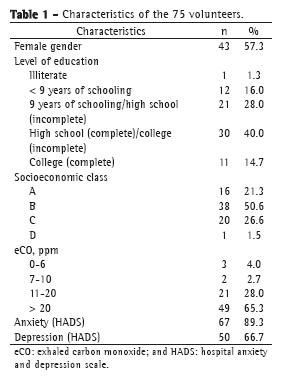 In order to assess the reproducibility of the Brazilian Portuguese-language version of the WSWS, we selected 76 volunteers (smokers only) from among those being treated at the PREVFUMO Outpatient Clinic. Of the 76 smokers, only 1 had an MMSE score < 21 and was therefore excluded from the evaluation. Of the 75 volunteers evaluated, most were female, had completed at least high school, and belonged to socioeconomic class A or B (Table 1).