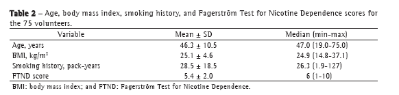 The mean age of the volunteers was 46.3 ± 10.5 years. Although the body mass index characterized the study population as overweight, the values were very close to the normal range. The mean smoking history was 28.5 ± 18.5 pack-years, nicotine dependence being low (Table 2).