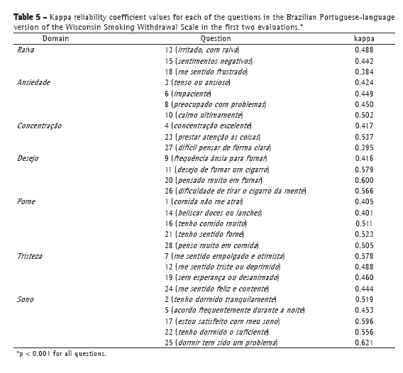 In conclusion, the present study showed that it is possible to translate and culturally adapt an instrument originally developed in a foreign language, the translated version showing excellent reproducibility. All of the domains of the Brazilian Portuguese-language version of the WSWS showed excellent intraobserver and interobserver reproducibility. The Brazilian Portuguese-language version of the WSWS is reproducible and easy to use. It can therefore be used as a tool for assessing the severity of the symptoms of nicotine withdrawal in the Brazilian population.