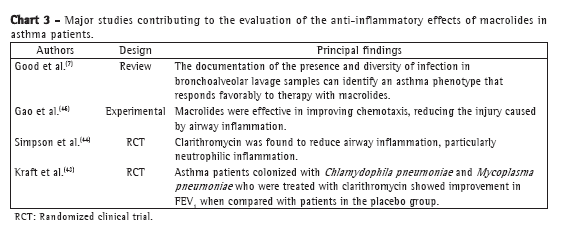 Even with all of these theoretical justifications based on experimental or mechanistic studies,(46) the positive effects of macrolides has not been consistent in the published clinical trials in asthma (Chart 3). Further studies investigating the effects of macrolides in asthma management are required. This research should focus not only on confirming that the use of macrolides has an anti-inflammatory effect in asthma but also on the impact of the benefits that these medications can bring to clinical practice.