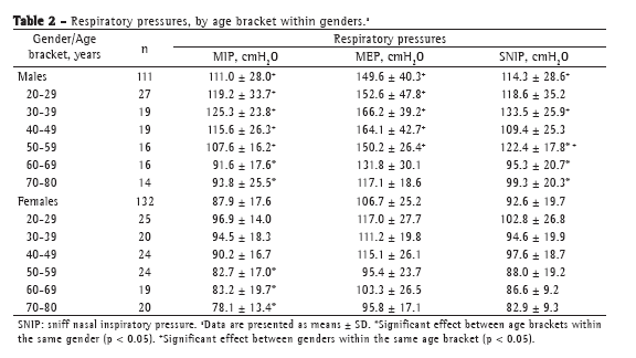 Sample size was calculated using a t-test based on mean population and maximum standard deviation of SNIP found in a study conducted by Uldry  Fitting,(6) and values of p < 0.05 (at a power of 99% with a confidence interval of 5%) were considered statistically significant. The suggested sample size was 260 individuals, with an expected interclass correlation coefficient of 7.86 cmH2O. Data were expressed as mean ± standard deviation. We applied the Kolmogorov-Smirnov test for normality in order to determine data distribution. We compared MIP, MEP and SNIP values between genders using unpaired t-tests and between age brackets with ANOVA. If a significant F ratio was obtained, post-test comparisons were conducted with the Newman-Keuls test. Pearson's correlation coefficient was applied in order to correlate SNIP with the study variables. Linear regression analysis was used in order to obtain predictive equations for independent variables that correlated with SNIP. The lower limits of the regression model were calculated from the 5th percentile of the residual standard deviation, assuming a Gaussian distribution, and were estimated as follows(21):