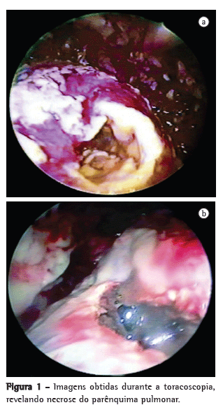 Os tratamentos para empiema incluíam apenas antibióticos, toracocentese, toracostomia (com drenagem aberta ou fechada) e toracotomia.(1,3) Com o advento da cirurgia minimamente invasiva, a toracoscopia foi adicionada ao arsenal terapêutico.(4,5) A toracoscopia propicia uma visão ampla da cavidade pleural, além de permitir a secção de aderências pleurais, a sucção de materiais e a remoção do excesso de fibrina depositado nas pleuras parietal e visceral.(4,5) Em alguns casos, a toracoscopia revela necrose pulmonar focal, também conhecida como gangrena pulmonar ou pneumonia necrosante (PN).(6)