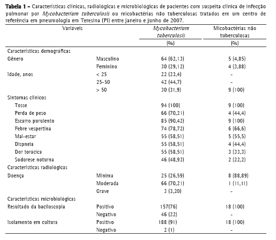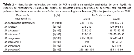 Objetivo: Identificar as espécies de micobactérias encontradas no escarro de pacientes com suspeita de tuberculose pulmonar e analisar o impacto dessas identificações na abordagem terapêutica. Métodos: Foram avaliados 106 pacientes com suspeita de tuberculose pulmonar encaminhados para o serviço de pneumologia de um hospital público em Teresina, Piauí. Espécimes de escarro matinal foram avaliados quanto à presença de micobactérias por baciloscopia e cultura. Foram utilizadas PCR e análise de restrição enzimática do gene hsp65 (PRA-hsp65) para a identificação das cepas de micobactérias isoladas em cultura. Resultados: Foram analisadas 206 amostras de escarro. A idade dos pacientes variou de 15 a 87 anos, sendo 67% do gênero masculino. Tosse ocorreu em 100% dos casos. O padrão radiográfico predominante foi de lesão moderada, observada em 70%. A positividade no esfregaço foi de 76%, e isolamento em cultura ocorreu em 91% das culturas executadas. Testes tradicionais identificaram micobactérias não tuberculosas (MNT) em 9% dos isolados. O método PRA-hsp65 confirmou esses dados, mostrando sete padrões de bandas capazes de identificar as espécies de MNT isoladas: Mycobacterium kansasii; M. abscessus 1; M. abscessus 2; M. smegmatis; M. flavescens 1; M. gordonae 5 e M. gordonae 7. Todos os pacientes com MNT tinham mais de 60 anos, e observaram-se bronquiectasias em 88% das radiografias. Houve dois casos de reinfecção, identificados inicialmente como infecção por M. abscessus e M. kansasii. Conclusões: As MNT causam infecção pulmonar em pacientes imunocompetentes, e a identificação das MNT é importante para estabelecer o diagnóstico correto e a decisão terapêutica mais adequada. O método PRA-hsp65 é útil para identificar espécies de MNT e pode ser implantado em laboratórios de biologia molecular não especializados em micobactérias.