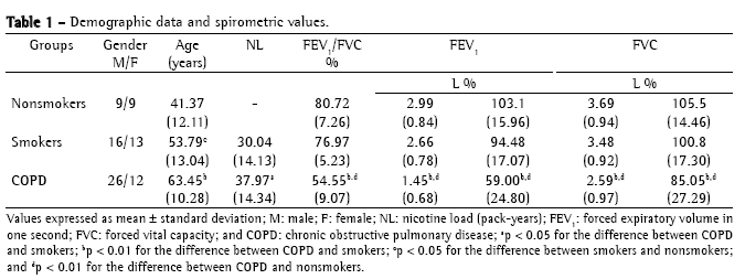 This project was approved by the Ethics in Research Committee of the Clementino Fraga Filho University Hospital of the Federal University of Rio de Janeiro, and all participants in the study gave written informed consent. A total of 85 people were evaluated: 38 patients with COPD, 29 smokers, and 18 nonsmokers without airflow obstruction. The diagnosis of COPD was made based on the criteria of the Global Initiative for Chronic Obstructive Lung Disease (GOLD); (1) according to which 3 cases were defined as mild, 18 as moderate, and 17 as severe.
