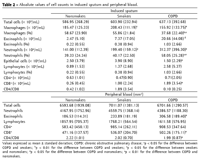 Some authors propose that the smoking-related inflammation has two phases: the initial phase, which begins in the epithelium and submucosa, with the participation of neutrophils and macrophages; and the late phase, in which there is the additional participation of lymphocytes .Our findings demonstrate that the numbers of CD8+ T lymphocytes and neutrophils are significantly elevated in the sputum of patients with COPD, whereas smokers present increased neutrophils in relation to nonsmokers, as has also been reported in the literature.(18) Therefore, the higher percentages of CD8+ T lymphocytes and neutrophils in IS could help to identify smokers who already present an inflammatory model similar to that observed in patients with COPD. In the literature, there are reports on increased neutrophils in bronchoalveolar lavage and in IS of patients with COPD; however, these findings have not been reproduced in studies utilizing material from bronchial biopsy. The principal explanation for this fact refers to the rapid migration of neutrophils from the vessel toward the airways, making it more common to find them within the airways than in the bronchial wall or in the pulmonary parenchyma.