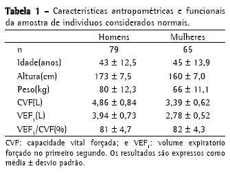 Foram incluídos, na segunda fase do estudo, 65 mulheres (idade entre 20 e 77 anos) e 79 homens (idade entre 25 e 80) com estaturas situadas na faixa de referência das equações comparativas. As características antropométricas e funcionais são mostradas na Tabela 1.