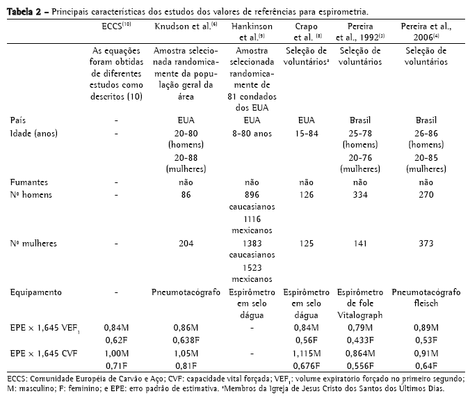Antes da disponibilidade de equações nacionais para a espirometria, um estudo comparou os valores obtidos em uma pequena amostra de indivíduos considerados 'normais' com os valores previstos por equações estrangeiras,(5) tendo concluído pela melhor aproximação com os valores previstos sugeridos por Knudson et al.(6) A equação de Knudson et al. incluiu uma amostra pequena de homens normais (apenas 86), sendo inusitada a inclinação da estatura em relação à idade para o sexo masculino, o que resulta em valores acentuadamente subestimados em indivíduos de baixa estatura. Os valores teóricos obtidos para a população brasileira em 1992(3) e os valores obtidos por Knudson et al.(6) foram comparadas em um estudo que mostrou que as discordâncias resultam em mudanças freqüentes nos diagnósticos espirométricos.(7) Porém, diversos laboratórios continuam a usar os valores obtidos por Knudson et al. como referência.