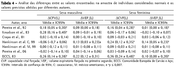 Na segunda fase, a análise das diferenças entre os valores médios encontrados na nova amostra de brasileiros normais e os valores previstos de CVF e VEF1 obtidos pelas sete equações não revelou diferença significativa, independentemente do sexo, para três dessas equações: Pereira et al. (2006),(4) Crapo et al.(8) e Hankinson et al.(9) para méxicoamericanos (Tabela 4). Nas demais equações, houve diferença estatística significativa.