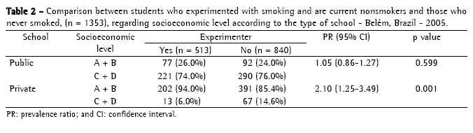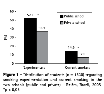 Objetive: To analyze the variables related to smoking initiation among adolescent students in two high schools (one public and one private) in the city of Belém, Brazil, in 2005. Methods: An anonymous self-report questionnaire - comprising 27 closed questions regarding smoking experimentation, smoking habit, access to buying cigarettes, reasons for smoking experimentation, self-perception regarding academic performance, conversations about smoking with the family, and socioeconomic level - was used for data collection. The study comprised 1520 students: 724 (47.6%) from the private school and 796 (52.4%) from the public school. Results: Mean age of participants was 16.5 years. Of the 1520 students evaluated, 669 (44%) reported experimenting with smoking, and 11% smoked regularly. In the public school and the private school, respectively, 51.2% and 36.7% of the participants had experimented with smoking (p = 0); 14.6% and 7%, respectively, were regular smokers (p = 0). We found that, in both schools, the following factors were associated with smoking initiation and current smoking: curiosity, presence of smokers as social contacts, not being praised for not smoking, and perceiving oneself as having poor or mediocre academic performance. Socioeconomic level was found to be associated with experimentation and current smoking only among experimenters of higher socioeconomic classes (A and B) in the private school. Conclusions: Among the students evaluated, the variable most closely associated with smoking was curiosity. Experimentation and regular tobacco use were more common in the public school than in the private school.