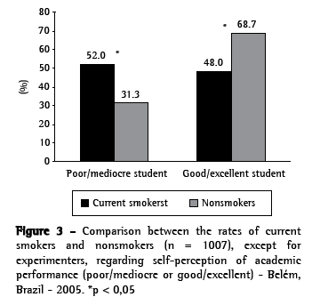 The self-perception of students regarding their poor academic performance was shown to be associated with smoking initiation and current smoking, since considering their academic performance poor or mediocre was significantly present among the experimenters in the public school. These findings are in agreement with those of a follow-up study(20) in which the students who reported mediocre or below average academic performance were more predisposed to the genesis and maintenance of the smoking habit.