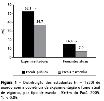 Objetive: To analyze the variables related to smoking initiation among adolescent students in two high schools (one public and one private) in the city of Belém, Brazil, in 2005. Methods: An anonymous self-report questionnaire - comprising 27 closed questions regarding smoking experimentation, smoking habit, access to buying cigarettes, reasons for smoking experimentation, self-perception regarding academic performance, conversations about smoking with the family, and socioeconomic level - was used for data collection. The study comprised 1520 students: 724 (47.6%) from the private school and 796 (52.4%) from the public school. Results: Mean age of participants was 16.5 years. Of the 1520 students evaluated, 669 (44%) reported experimenting with smoking, and 11% smoked regularly. In the public school and the private school, respectively, 51.2% and 36.7% of the participants had experimented with smoking (p = 0); 14.6% and 7%, respectively, were regular smokers (p = 0). We found that, in both schools, the following factors were associated with smoking initiation and current smoking: curiosity, presence of smokers as social contacts, not being praised for not smoking, and perceiving oneself as having poor or mediocre academic performance. Socioeconomic level was found to be associated with experimentation and current smoking only among experimenters of higher socioeconomic classes (A and B) in the private school. Conclusions: Among the students evaluated, the variable most closely associated with smoking was curiosity. Experimentation and regular tobacco use were more common in the public school than in the private school.