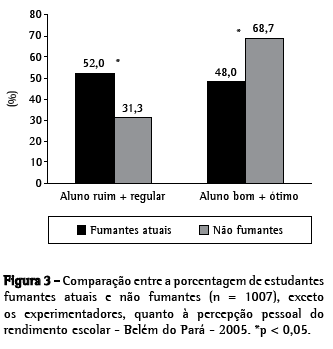 A percepção pessoal do aluno em relação ao baixo rendimento escolar mostrou associação com a iniciação do tabagismo e fumo atual, pois o fato de se considerar um aluno regular ou ruim esteve presente de forma significante entre os experimentadores da escola pública. Estes achados concordam com um estudo de seguimento,(20) onde alunos que referiram uma performance escolar mediana ou abaixo da média em relação à sua turma estariam muito mais predispostos à gênese e manutenção do tabagismo.