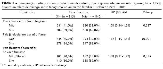 No que concerne à relação entre experimentar cigarros e a ocorrência de diálogo sobre tabagismo no ambiente familiar, a Tabela 1 demonstra que aqueles estudantes cujos pais não conversavam sobre tabagismo em casa ou que afirmaram que os pais não ficariam aborrecidos se eles fumassem, não apresentaram diferenças em relação àqueles cujos pais conversam ou ficariam aborrecidos. Porém, estudantes que nunca foram elogiados por não fumar apresentaram uma taxa de experimentação de cigarro maior (razão de prevalência [RP] = 1,32; intervalo de confiança de 95% [IC95%]: 1,15-1,51) do que os que afirmaram já terem sido elogiados.