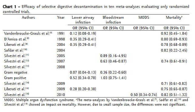 The issue of SDD has been addressed in 60 RCTs and 10 meta-analyses including only RCTs (Chart 1). In all meta-analyses in which pneumonia was the endpoint, SDD using parenteral, as well as enteral (oropharyngeal and intestinal), antimicrobials has consistently been shown to reduce the number of cases of pneumonia. The parenteral component effectively controls primary endogenous pneumonias caused by "normal" bacteria, whereas the enteral antimicrobials reduce secondary endogenous pneumonias due to "abnormal" bacteria, including Pseudomonas spp. and Acinetobacter spp. Although the authors are concerned about Actinomyces spp., this microorganism cannot be considered to be among the potential agents of pneumonia in mechanically ventilated ICU patients. Nevertheless, Actinomyces spp. are covered by the SDD antimicrobials. In 8 of the 10 meta-analyses, mortality was the outcome measure. There was a consistent survival benefit in all meta-analyses that assessed the full SDD protocol with parenteral and enteral antimicrobials, assuming that the sample size was sufficient. Opinion leaders have expressed concerns regarding resistance, and, despite the fact that those concerns are based on low level evidence, this has hindered the implementation of SDD. Resistance was not a clinically relevant problem in the 60 RCTs evaluating SDD.(2) Two large Dutch RCTs in which the endpoint was resistance demonstrated that the carriage of and infection with multiresistant aerobic gram-negative bacilli were significantly lower after SDD than after the standard therapy.(3)