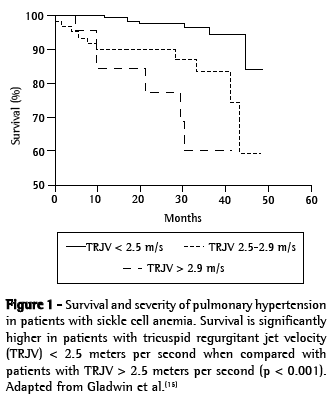 Epidemiology Pulmonary hypertension, a disorder characterized by increased pulmonary artery pressure and pulmonary vascular resistance, has been increasingly recognized in patients with sickle cell anemia.(7-12) For example, the prevalence of pulmonary hypertension diagnosed by echocardiogram in patients examined at referral centers ranges from 20 to 30%.(7,11) In autopsy studies, approximately 75% of patients with sickle cell anemia present histological evidence of pulmonary hypertension.(13) In addition, various retrospective studies demonstrate that patients with pulmonary hypertension associated with sickle cell anemia have a worse prognosis. One study demonstrated a 40% mortality rate in a 22-month follow-up period with an odds ratio of 7.86 and a 95% confidence interval (95% CI) of 2.63-23.4.(11) In a study by other authors, mean survival for patients with sickle cell anemia complicated by chronic pulmonary disease and pulmonary hypertension was 2.5 years.(4) Similarly, another study(14) demonstrated a 50% mortality within two years in patients with pulmonary hypertension confirmed by right heart catheterization. These retrospective data were confirmed by a screening study of pulmonary hypertension in sickle cell anemia carried out by the National Institutes of Health.(15) In the present, prospective study, 195 adults with sickle cell anemia were assessed by echocardiogram, using tricuspid regurgitant jet (TRJ) velocity to estimate systolic pulmonary artery pressure. Pulmonary hypertension was defined as TRJ velocity = 2.5 m/sec. The prevalence of pulmonary hypertension in the present study was 32%, and 9% of the patients presented moderate to severe increases of systolic pulmonary pressure (defined as TRJ velocity = 3 m/sec).