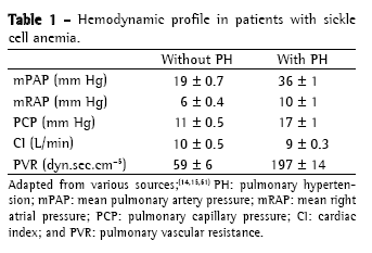 In contrast with patients presenting traditional forms of pulmonary arterial hypertension (idiopathic, associated with scleroderma, for example) who have symptoms such as a mean pulmonary artery pressure (mPAP) of 50-60 mmHg, patients with sickle cell anemia present a moderate increase in mPAP (30-40 mmHg), together with a mild increase in pulmonary vascular resistance (Table 1). Another characteristic finding of this group of patients is the mild increase in pulmonary capillary pressure, which does not occur in patients with pulmonary arterial hypertension. Specifically in patients submitted to hemodynamic testing in our department, 54% of the patients present pulmonary arterial hypertension, and 46% present pulmonary venous hypertension, mostly associated with diastolic dysfunction, which suggests that the etiology of pulmonary hypertension in patients with sickle cell anemia is multifactorial. Our group also using echocardiography to investigate the diastolic function of 141 patients.(44) Of this population, 18% presented echocardiographic evidence of diastolic dysfunction. In addition, diastolic dysfunction contributed to increases in TRJ velocity in only onethird of the patients with pulmonary hypertension. The most important finding, however, was that the combination of diastolic dysfunction and pulmonary hypertension increases the risk of mortality in these patients.