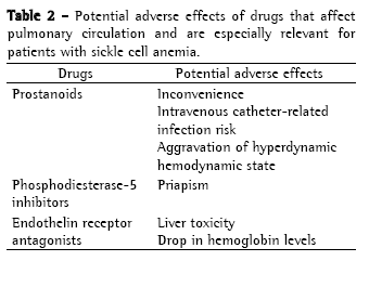 Specific therapy for pulmonary arterial hypertension There is no high quality or long-term follow-up evidence in the evaluation of specific therapies for pulmonary arterial hypertension in patients with sickle cell anemia. The choice of drugs, at the moment, is empirical and based on the profile of adverse effects or on the preference of the health professional. However, there are specific effects of different drugs that can negatively interact with pathophysiological aspects of sickle cell anemia (Table 2).