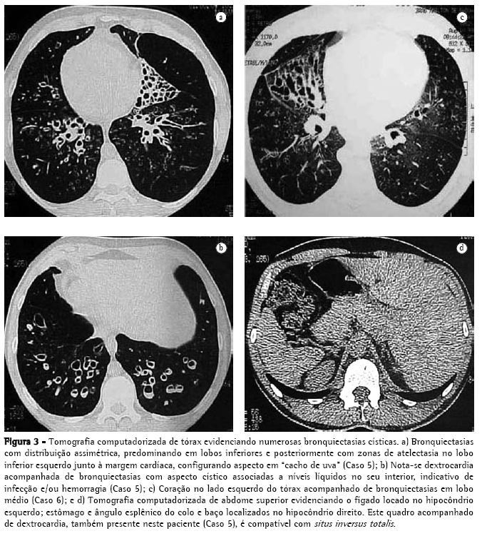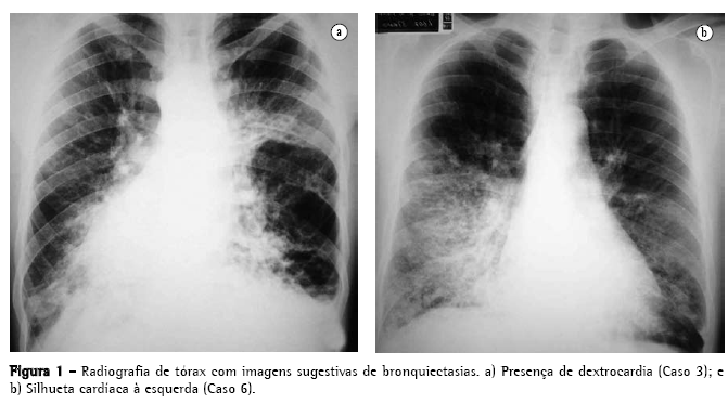 A radiografia simples de tórax de cada paciente mostrou espessamento das paredes brônquicas, atelectasias e imagens radiológicas sugestivas de bronquiectasias, sendo que em cinco casos, também se observou situs inversus (Figura 1).