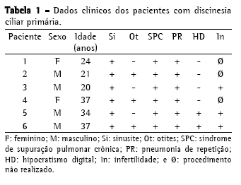 Foram encontrados seis casos de DCP, sendo cinco casos de SK completa e um caso de SK incompleta. Dos seis pacientes estudados, quatro eram do sexo masculino e dois eram do sexo feminino e a idade média foi de 32,5 anos (intervalo de 20 a 37 anos). Todos os pacientes tinham história de infecções crônicas do trato respiratório, tanto superior (sinusopatias crônicas) quanto inferior (pneumonias de repetição). As otites crônicas também foram manifestações comuns. Os pacientes do sexo masculino relataram expectoração mucopurulenta abundante, algumas vezes acompanhada de escarros hemoptóicos, com evolução crônica. Os dois pacientes do sexo feminino, nos quais a expectoração não era tão intensa, relataram ser portadoras de "bronquite" desde a infância. Houve dois casos (Casos 5 e 6) de pacientes irmãos os quais também apresentavam hipocratismo digital.