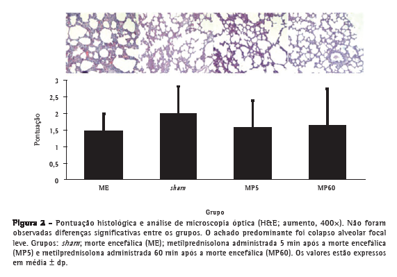 A grande maioria dos estudos experimentais tem demonstrado um aumento significativo de moléculas inflamatórias e interleucinas imediatamente após a indução da morte encefálica.(22,23) Demonstrou-se que a citocina pró-inflamatória TNF- está significativamente suprarregulada no tecido pulmonar após a morte encefálica(12,24) e desempenha um papel importante no desenvolvimento de lesão pulmonar.(22) No presente estudo, a morte encefálica resultou em uma resposta inflamatória sistêmica e a administração de metilprednisolona associou-se a uma redução da expressão de TNF- no tecido pulmonar. McLean et al. obtiveram resultados semelhantes em um estudo sobre os efeitos de um glicocorticoide sobre a função miocárdica em um modelo suíno de morte encefálica.(25)