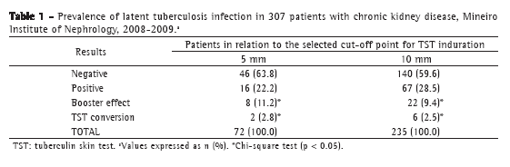 We used two cut-off points for TST induration. In general, for patients with CKD, a positive TST result was defined as an induration ≥ 10 mm. For kidney transplant candidates, HIV-positive patients, immunosuppressed patients, patients using prednisone or equivalent at a dose ≥ 15 mg/day for more than one month, and candidates for the use of TNF- inhibitors, a positive TST result was defined as an induration ≥ 5 mm. The latter cut-off point was chosen on the basis of recommendations made by the American Thoracic Society and other authors,(13,14) given that patients receiving immunosuppressants after transplantation have a high risk of developing active tuberculosis.