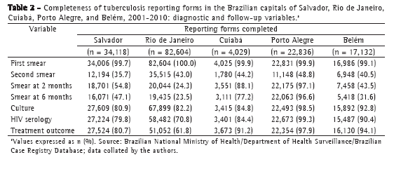 To that end, we conducted a descriptive study in which we evaluated the SINAN database information for the Brazilian capitals of Belém, Rio de Janeiro, Cuiabá, Salvador, and Porto Alegre for the 2001-2010 period; applying the selection criterion of investigating the greater metropolitan areas of the capitals where the incidence of tuberculosis was highest in 2010.(3) The information on the completeness of reporting forms was obtained from the SINAN tabulations, with automatic table generation, by two previously trained undergraduate investigators, under the supervision of the researchers. We excluded fields that read "omitted", "left blank", or "in progress". The variables of interest were grouped as follows: sociodemographic variables-gender, age group, and institutionalization; clinical variables-type of admission, clinical presentation of tuberculosis (pulmonary or extrapulmonary, and, in cases of extrapulmonary tuberculosis, whether it presented as a single-system or multisystem disease [classified in the present study as extrapulmonary tuberculosis 1 and 2, respectively]), and HIV co-infection; and diagnostic and follow-up variables-first and second smears, smears at 2 and 6 months of treatment, sputum culture, HIV serology, and treatment outcome. To analyze the completeness of the reporting forms, we used the SINAN qualitative evaluation system, with categories ranging from 1 to 4, corresponding to completeness of 0.0-25.0%, 25.1-50.0%, 50.1-75.0%, and 75.1-100.0%, respectively.(9)