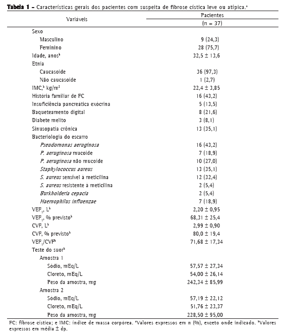 A Tabela 1 mostra as características gerais dos pacientes. O grupo mostrou predomínio do sexo feminino, com 28 mulheres (75,7%) e 9 homens (24,3%). A média de idade foi de 32,5 ± 13,6 anos, (variação, 14-67 anos). A grande maioria era de etnia caucasiana (apenas 1 era não caucasiano), e 16 pacientes (43,2%) referiram ter algum familiar (primeiro e segundo graus) com diagnóstico confirmado de FC. Cinco pacientes (13,5%) tinham diagnóstico de insuficiência pancreática exócrina. A média do IMC foi de 22,4 ± 3,85 kg/m2 (variação, 15,3-30,0 kg/m2). Baqueteamento digital foi encontrado em 21,6% dos pacientes. Apenas 3 pacientes (8,1%) apresentaram critérios diagnósticos de diabete melito, e 13 (35,1%) os apresentaram para sinusopatia crônica. Em relação à microbiologia do escarro, P. aeruginosa foi a bactéria mais frequentemente isolada (43,2%), seguida por S. aureus (35,1%). H. influenzae foi identificado em 7 pacientes (18,9%), enquanto B. cepacia foi isolada em 5,4% dos pacientes. A média de VEF1, em % do previsto, foi de 68,31 ± 25,40%, a de CVF foi de 80,0 ± 19,4%, enquanto a relação VEF1/CVF foi de 71,68 ± 17,34%. Os eletrólitos no suor foram avaliados em duas amostras, sendo que o peso médio da primeira amostra foi de 242,00 ± 85,99 mg e o da segunda foi de 228,50 ± 95,00 mg. A concentração de cloreto na primeira e segunda amostras foi, respectivamente, de 54 ± 26,14 mEq/L e 51,76 ± 23,37 mEq/L.