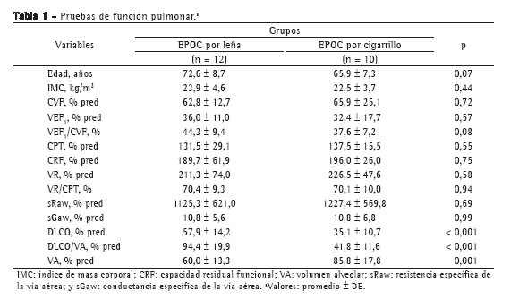 Las pacientes con EPOC-L tenían una historia de 41,2 ± 9,8 años de exposición a humo de leña y las pacientes con EPOC-C habían fumado 47,0 ± 16,2 paquetes/año. No hubo diferencias significativas en la edad o en el índice de masa corporal entre los dos grupos (Tabla 1).