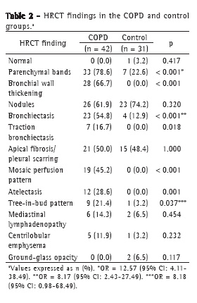 After age matching, parenchymal bands, bronchial wall thickening, bronchiectasis, mosaic perfusion pattern, and laminar atelectasis were found to be significantly more common in the COPD group than in the control group. As can be seen in Table 4, those abnormalities occurred predominantly in the lower lung fields (in 76.6%), having occurred in the middle lung fields in 15.6% and in the upper lung fields in 7.8%.