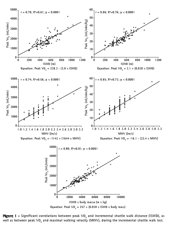 The main finding of this study was the considerable influence that MWV and ISWD had on the peak VO2 obtained on the ISWT. The correlations between peak VO2 and ISWD, between peak VO2 and MWV, and between peak VO2 and ISWD × body mass ranged from 0.75 to 0.90. These values are similar to those described in the literature for the correlation between ISWD and peak VO2 obtained under laboratory conditions in patients with cardiopulmonary disease. Consistent correlations between peak VO2 and ISWD or between peak VO2 and ISWD × body mass obtained in CPET have been described in COPD patients (range, 0.73-0.88).(2,10,19,20) Correlations of this magnitude have also been described during CPET in patients with idiopathic pulmonary fibrosis(21) and in patients with heart disease.(22-24) These results support the assertion that the ISWT is a suitable tool to assess the functional capacity of such patients. Our results indicate that the peak VO2 obtained during the ISWT might be adequately estimated by using ISWD, MWV, or body mass. In fact, Léger & Lambert(25) reported similar results in the study in which they developed the precursor to the ISWT (the incremental shuttle run test). In that study, the peak VO2 of young adults was adequately predicted by the running speed, with a correlation of r = 0.84. In a study conducted by Cooper, who used the 12-min run test,(26) the 12-min run distance was also the most important determinant of cardiorespiratory fitness in healthy young adults, a finding similar to those of the present study. Even in CPET, the work rate, or power, has been identified as the main determinant of peak VO2.(27) Because the ISWT is performed on a flat surface, the MWV ultimately represents the workload of the test.