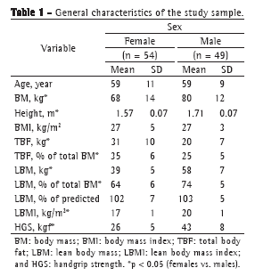 Body mass (in kg) and height (in m) were measured, and the body mass index (in kg/m2) was calculated. Body composition was assessed using a portable scale with a tetrapolar bioelectrical impedance system (TBF-310GS; Tanita, Arlington Heights, IL, USA).(15) Total body fat (TBF), total body water, and lean body mass (LBM) were assessed using regression equations.(16) The LBM was also expressed as a percentage of the predicted value.(17) Spirometry was performed using a hand-held spirometer (Spiropalm; Cosmed, Pavona di Albano, Italy) in accordance with the criteria established by the Brazilian Thoracic Association.(13) We measured FEV1, FVC, and FEV1/FVC ratio. The HGS of the dominant side was assessed using a hydraulic dynamometer (HS5001; Carci, São Paulo, Brazil).(18) Three measurements were performed at least 30 s apart. The highest value was selected for further analysis.