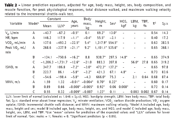 Various cardiovascular and ventilatory variables were determined in the present study by a combination of age, sex, height, and body mass (R2 ranging from 0.54 to 0.65). Our results are similar to those described by Neder et al.,(29) who reported that several cardiovascular and ventilatory variables might be determined by the combination of age, sex, height, and body mass, with an R2 ranging from 0.102 to 0.691.