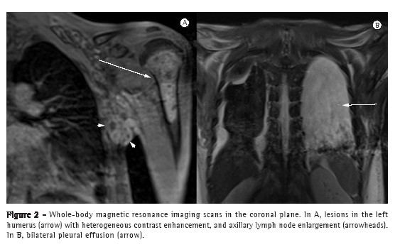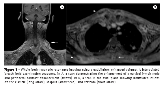 Paracoccidioidomycosis, a systemic fungal disease caused by the fungus Paracoccidioides brasiliensis, is endemic in Central and South America.(2,3) In Europe and North America, it is considered a rare imported disease, the incidence of which is expected to continue rising due to the increase in migration and international travel.(4) Given that the disease can affect virtually any organ, whole-body MRI seems to be a suitable diagnostic tool for evaluating systemic manifestations of disseminated paracoccidioidomycosis, because it provides a global view. The aim of the present report was to present the whole-body MRI findings of a patient with systemic manifestations of paracoccidioidomycosis, with an emphasis on lymphatic, skeletal, and pleural involvement. To our knowledge, thoracic findings of disseminated paracoccidioidomycosis on whole-body MRI have not been described previously.