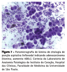 Em um estudo com 43 pacientes com adenocarcinoma de pulmão submetidos a EBUS-TBNA para estadiamento, as amostras linfonodais coletadas foram analisadas para epidermal growth factor receptor (EGFR, receptor do fator de crescimento epidérmico). Em 11 casos, os emblocados celulares foram positivos para EGFR, tendo sido todos os casos confirmados por sequenciamento direto. Em conclusão, o EGFR é facilmente detectado no material coletado por EBUS-TBNA.(34) Outro estudo, também com 43 portadores de neoplasia pulmonar não pequenas células, analisou alguns marcadores (mutações em KRAS, EGFR, BRAF e PIK3CA) no material coletado por EBUS-TBNA e por endoscopic ultrasound-guided fine-needle aspiration, conhecido como ecoendoscopia com agulha fina, havendo total concordância entre a análise dos marcadores tumorais realizada nos materiais citológicos aspirados pelos dois métodos e os materiais histológicos obtidos cirurgicamente.(35) Os autores concluíram que o material coletado durante a realização de EBUS-TBNA, se adequadamente preparado, possibilita a análise dos marcadores genéticos de neoplasia pulmonar.