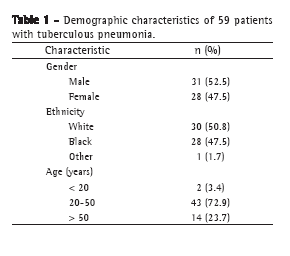 ResultsAmong the 59 patients with tuberculous pneumonia, there was a slight predominance of males and White individuals. Of the 59 patients, 43 (72.9%) were between 20 and 50 years of age (Table 1).