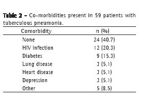 Objetivo: Estudar os aspectos clínicos, epidemiológicos, radiológicos e endoscópicos encontrados em indivíduos com pneumonia tuberculosa. Métodos: Entre dezembro de 2005 e fevereiro de 2007, foram estudados 2.828 pacientes com tuberculose que foram consecutivamente atendidos em uma unidade de saúde pública. Desses, 59 (2,1%) tiveram envolvimento pulmonar compatível com fístula entre um linfonodo e um brônquio. Resultados: Dos 59 pacientes estudados, 43 (73%) tinham entre 20 e 50 anos de idade, 31 (53%) eram do sexo masculino, e 28 (47%) eram negros. Os sintomas mais frequentes foram tosse (100%), febre (88%), expectoração (81%) e perda de peso (40%). Comorbidades foram registradas em 35 pacientes (59%), especialmente a infecção por HIV (20%) e diabetes (15%). Na radiografia de tórax, a consolidação predominou nos lobos superiores (em 68%). A confirmação diagnóstica (presença de BAAR) foi feita principalmente por baciloscopia direta do escarro, seguida por broncoscopia (LBA e biópsia brônquica). Lesões brônquicas claramente indicativas ou sugestivas de fístula foram identificadas em três casos e cinco casos, respectivamente. Conclusões: A pneumonia tuberculosa apresenta-se como uma infecção respiratória aguda, com tosse seca seguida por febre. A radiografia de tórax mostra consolidação alveolar. Na maioria dos casos, a pneumonia tuberculosa foi acompanhada por pelo menos uma comorbidade, especialmente a infecção por HIV, e a confirmação etiológica foi obtida principalmente através do exame de escarro direto para BAAR. Os achados de broncoscopia foram indicativos de fístula brônquica em oito casos (13%).