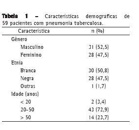 Dentre os 59 pacientes com pneumonia tuberculosa, houve discreta predominância de indivíduos do sexo masculino e de indivíduos brancos. Dos 59 pacientes, 43 (72,9%) tinham entre 20 e 50 anos de idade (Tabela 1).