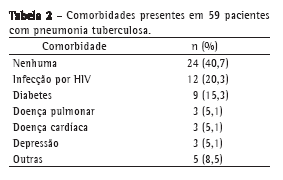 Observou-se que 35 (59,3%) dos pacientes apresentaram pelo menos uma comorbidade, especialmente infecção por HIV e diabetes (Tabela 2). Os sintomas mais comuns foram tosse, geralmente seca no início, e febre (Tabela 3).