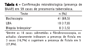 Obteve-se confirmação microbiológica principalmente por meio de baciloscopia, que foi positiva para BAAR em 41 (69,5%) dos 59 pacientes. Realizou-se broncoscopia em 18 pacientes (30,5%). Lesão da parede brônquica foi identificada e submetida a biópsia em 8 (44,4%) dos 18 pacientes. Os achados claramente indicaram a presença de fístula em 3 (16,7%), ao passo que em 5 (27,8%), os achados sugeriram a presença de fístula (evidência de cicatrização). Nos 8 pacientes, as alterações foram identificadas em grandes brônquios. Nos 18 pacientes submetidos a broncoscopia, fez-se o diagnóstico microbiológico por meio da análise das amostras da biópsia ou do LBA (Tabela 4).