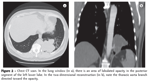 IntroductionThe development of the tracheobronchial tree begins on the 24th day of embryogenesis. The ventral wall of the pharynx of the fetus migrates caudally, forming the larynx and the trachea, as well as the right and left lung buds. The buds elongate, developing all of the lung segmentation by the 36th day. In the same period, the vascular supply, originating from branches of the splenic vascular plexus, accompanies the bronchial generations.(1) Congenital pulmonary anomalies are rare, the most common being lobar emphysema, cysts in the lungs, cystic adenomatoid malformation and pulmonary sequestration.(2) Bronchopulmonary sequestration is characterized by an area of abnormal, nonfunctional pulmonary tissue, which receives its blood supply via a systemic artery and has no connection with the tracheobronchial tree. In intralobar pulmonary sequestration, this tissue is located within the visceral pleura of a pulmonary lobe, and its venous drainage is into the pulmonary veins. Radiographic images play a fundamental role in establishing the diagnosis and provide the medical team with a vascular map for surgical planning.(3) We report a case of intralobar pulmonary sequestration in which diagnosis was delayed and hemoptysis was the clinical manifestation.